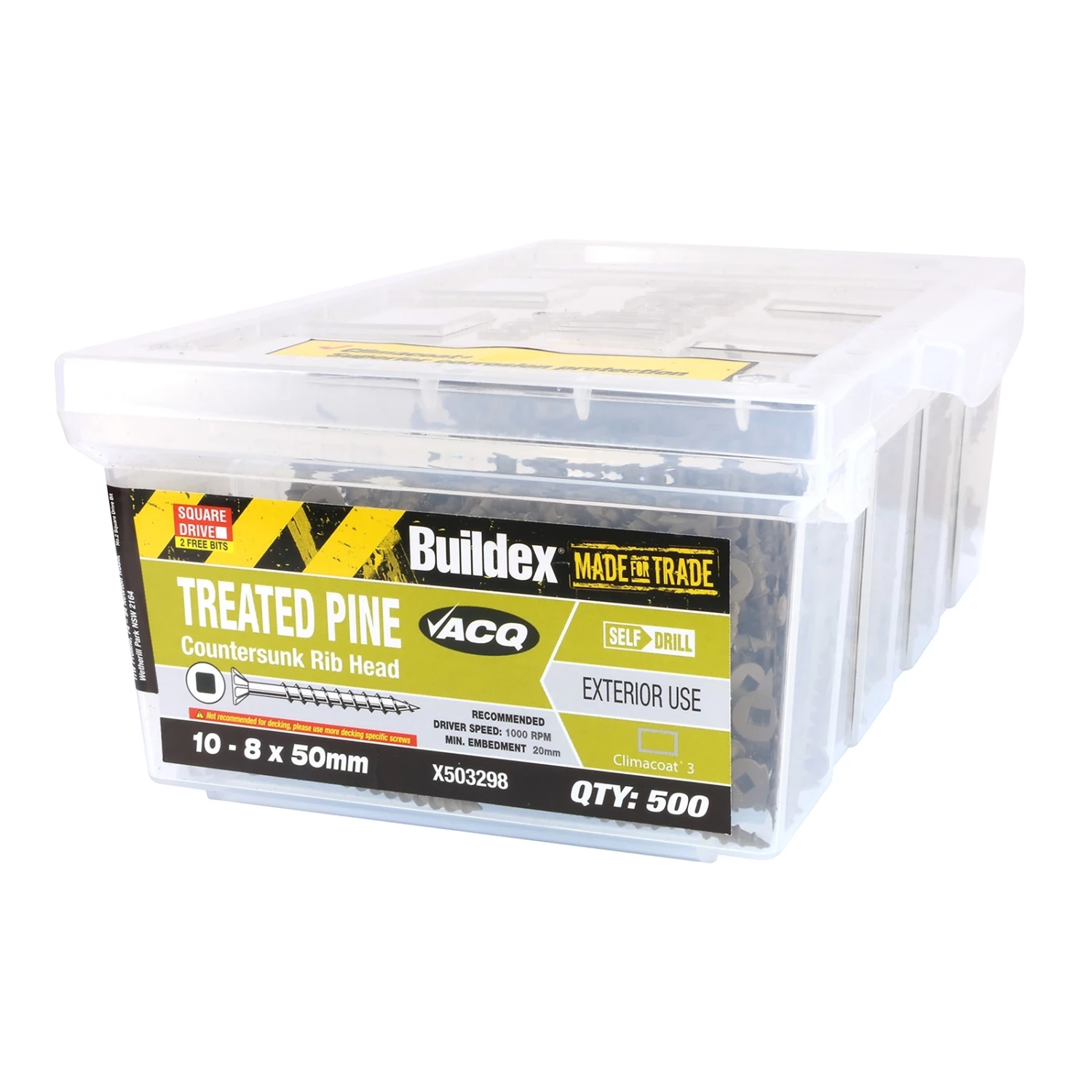Buildex® Treated Pine Screws are self-drilling, general purpose timber screws for external and treated pine applications. The The Climacoat® 3 coating makes them suitable for applications using treated pine. For general fixing into treated pine or soft timber where superior corrosion protection is required such as lattice panels, treated pine logs, etc.