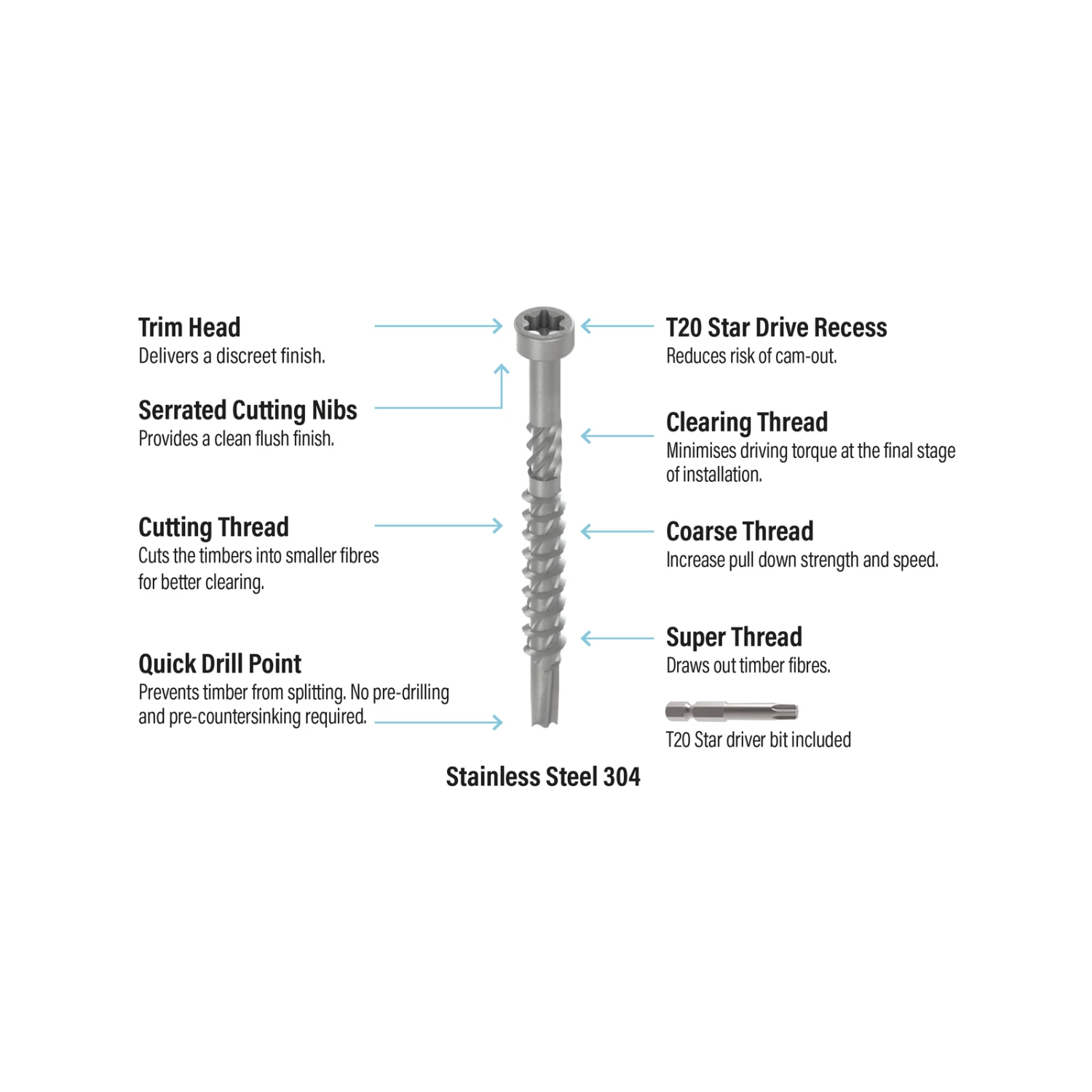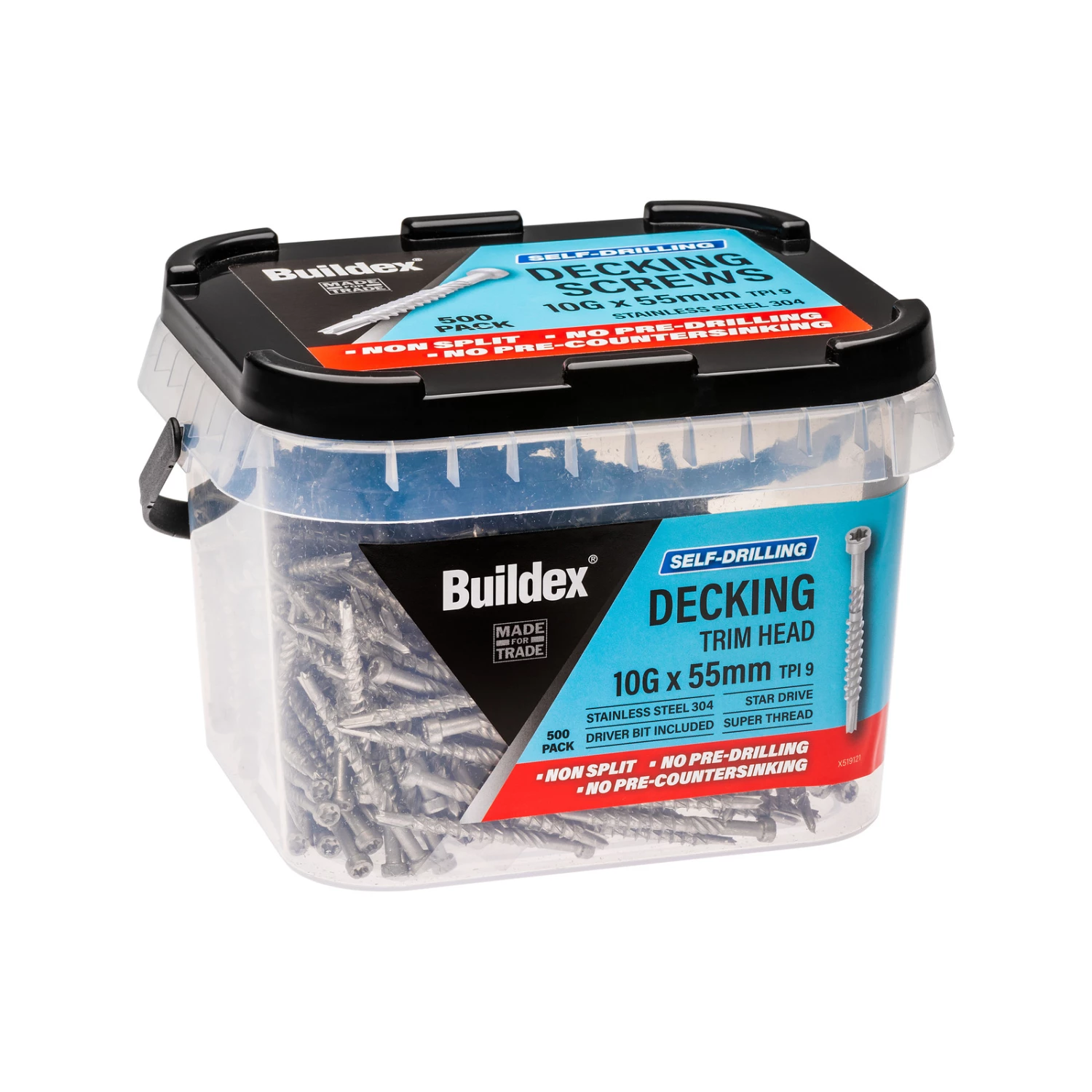 Buildex® Self Drilling Decking Screws are specifically designed for fixing hardwood and softwood decking boards to softwood timber floor joists for a flush finish. No pre-drilling or pre-countersinking.
