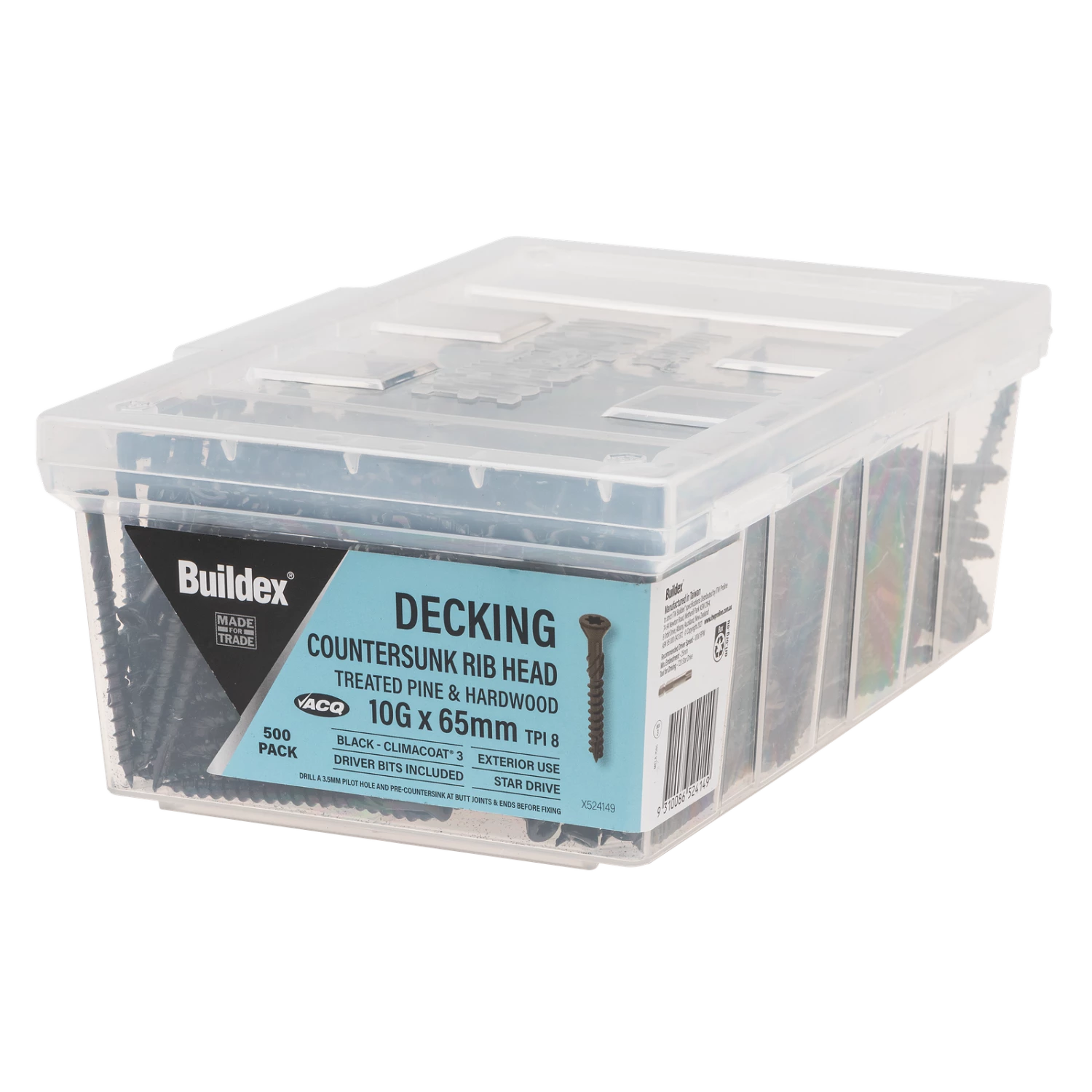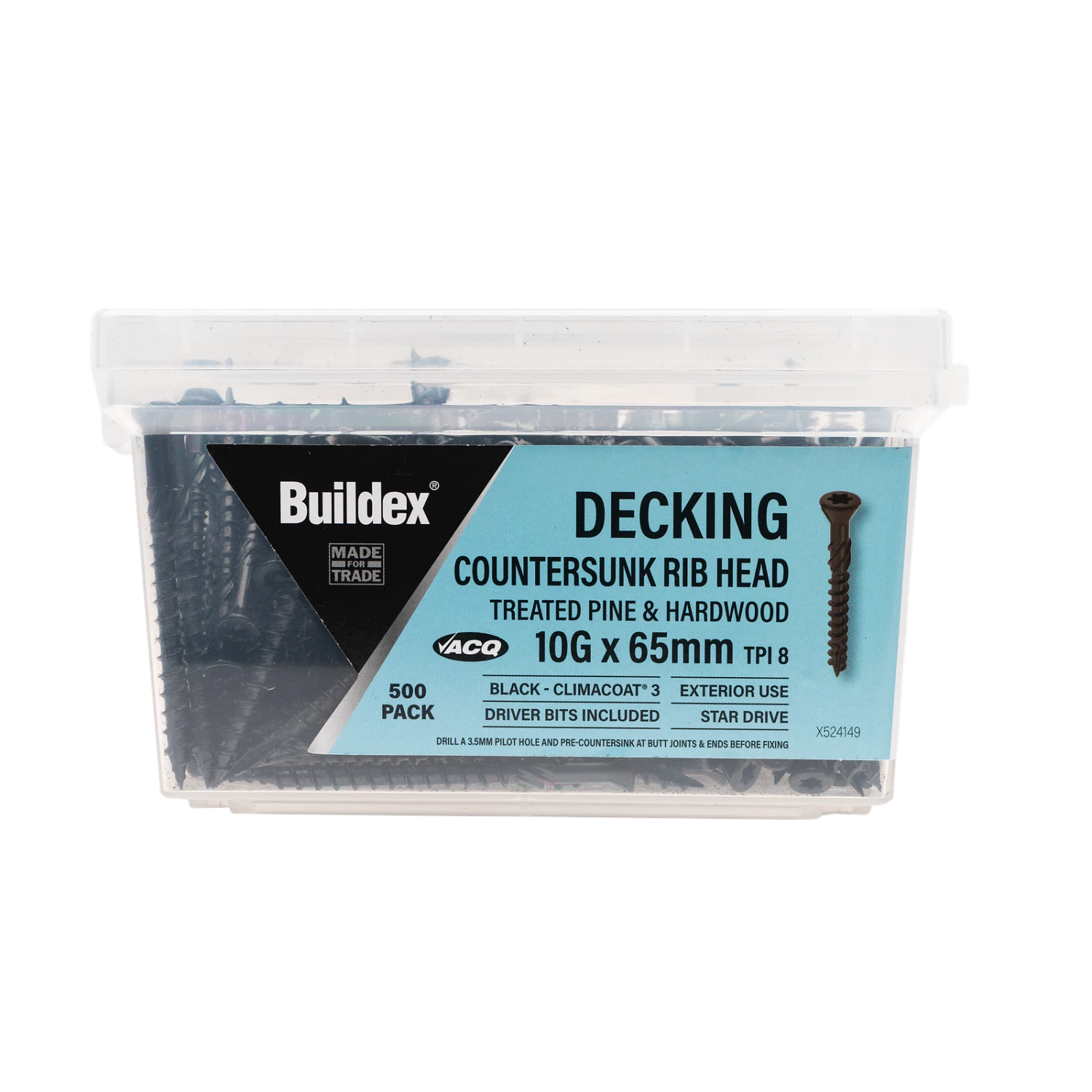 Buildex® Black decking screws are specifically designed for fixing hardwood or treated pine decking boards to softwood and hardwood floor joists for a flush finish. The Climacoat® 3 coating resists the corrosive effects of treated timbers, particularly ACQ.
