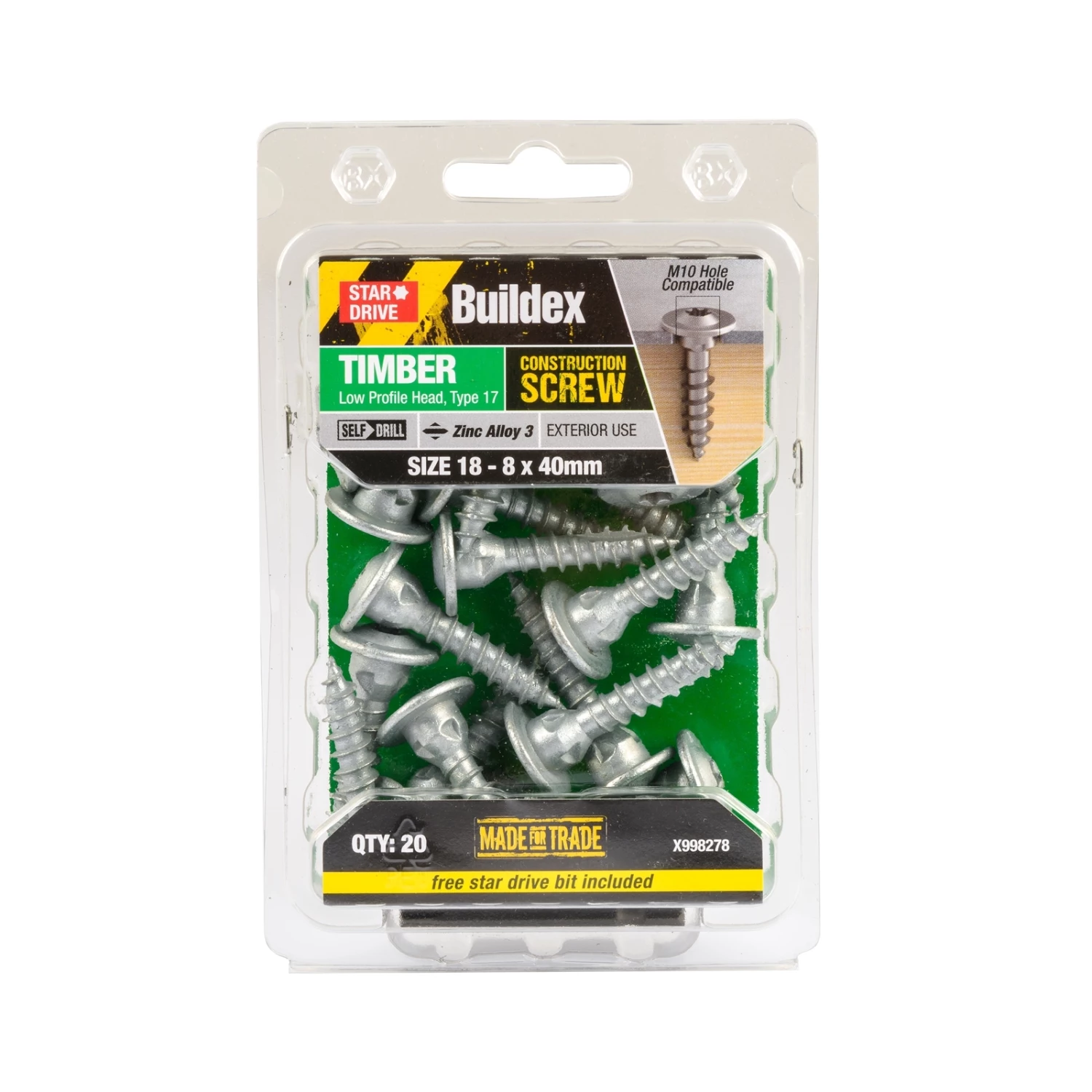 Buildex® Low Profile Head Construction Screws are self-drilling screws, designed specifically for fixing metal hardware with M10 holes to timber applications including post supports, reinforcement brackets, stair treads, fence posts, gate fittings