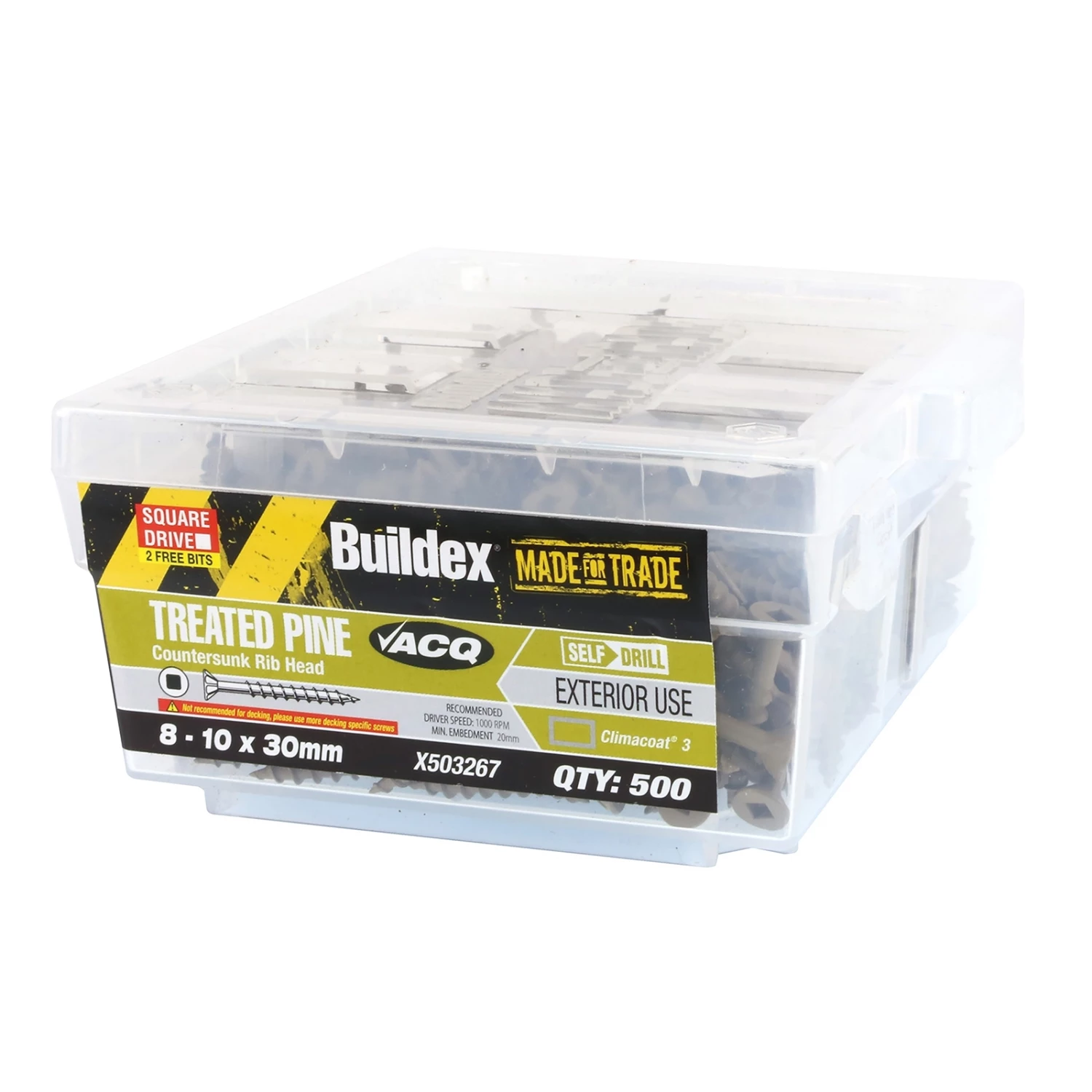 Buildex® Treated Pine Screws are self-drilling, general purpose timber screws for external and treated pine applications. The The Climacoat® 3 coating makes them suitable for applications using treated pine. For general fixing into treated pine or soft timber where superior corrosion protection is required such as lattice panels, treated pine logs, etc.